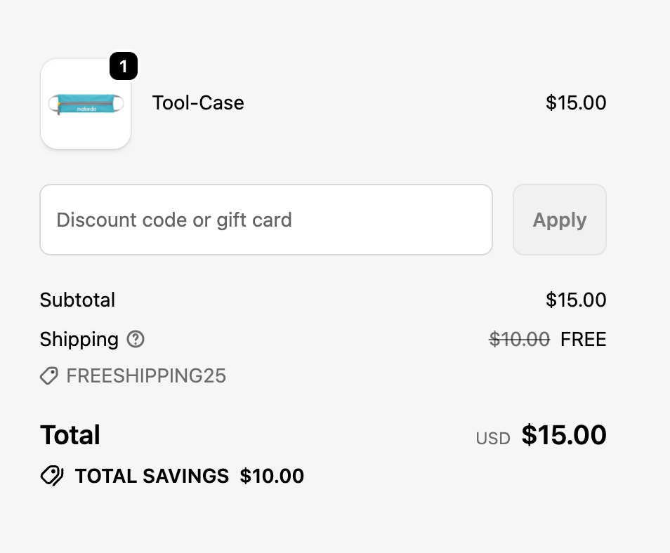 We are running a promotion that entitles you to free shipping for your Makedo order at checkout! There's nothing you need to do here to be eligible - the code "FREESHIPPING25" will be automatically applied at checkout.